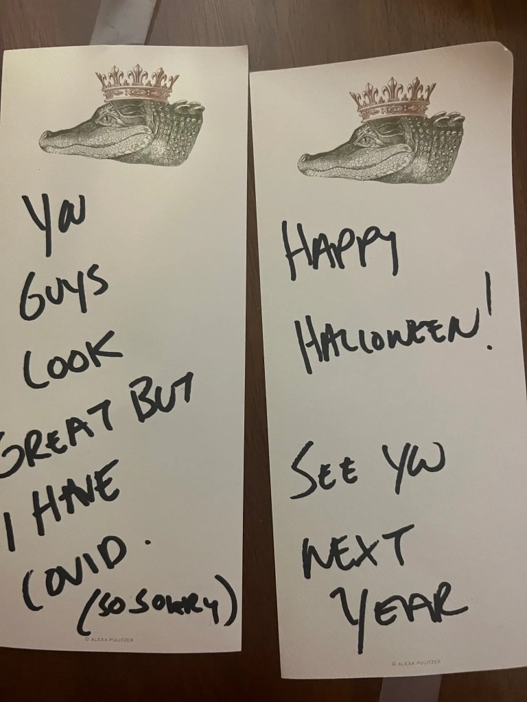 The Night: Still sick. Still positive, in the most negative way possible. Still depressed. Still everything is broken. Still the world is falling apart. Still my life is . . . whatever. The cats broke a few new things.The dryer broke. The drying rack broke. Pulling the drying rack out of the closet caused the broken closet to break even more. My computer is death rattling. Also it froze. I brought all the plants in. I left all the lights off and still kids came to the door and I was forced to stand behind the glass and explain that I had Covid and I was so so sorry. I left this note taped to the door.