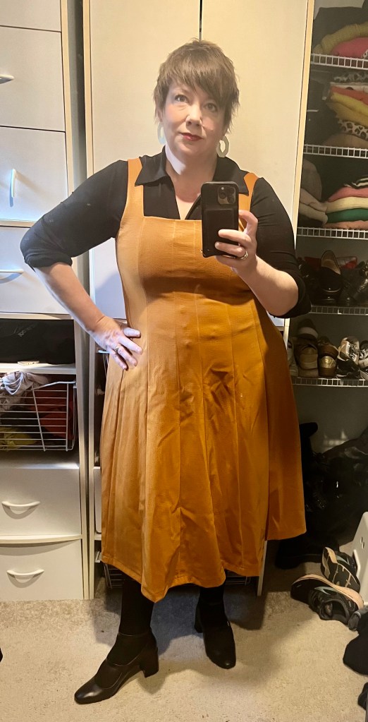 Dress: This is an A-line rusty/tan jumper/sleeveless dress. These days people call this material vegan leather, which is a fancy name for pleather, kin to vinyl. I’m not snooty about artificial materials. I live in 2023. I’m not a homesteader. I can’t sew shit on shit, I’m not made of money, and I’m easily seduced by things that sparkle. It’s safe to say most of my wardrobe (rayon, nylon, acrylic, viscose, spandex, et al) has roots in a lab, and would happily to sidle up to young Dustin Hoffman at a party and have just one word for him. And it’s not just clothes either. For many years, I had a naugahyde sofa. 1 I used to say, do you know how many innocent naugas had to die to make this sofa?2 And someone would quiet and sad imagining a decimated herds of naugas until I explained the joke.