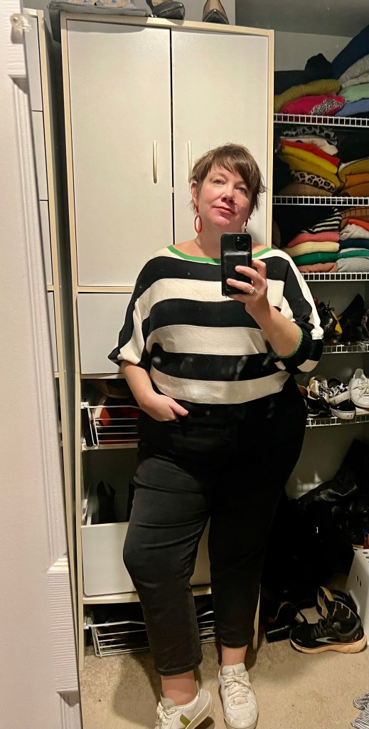 Sweater: Boat-neck, navy and white striped, puff sleeved cotton blend sweater. I bought this on considerable sale from Anthropologie while I was recuperating from Covid about six weeks ago. I get why it was on sale. It has a weird fitted bottom, which it not a thing people love in a sweater. The material (some cotton/acrylic situation) has a texture that reminds me a bit of woven placemats from the early 1980s, and thus makes me crave a salad with Green Goddess dressing. And the sleeves. Y’all. The picture does not do these sleeves justice. These are full on Gilded Age lawn party puff sleeves. These are sleeves that could make covetous Canadian orphans commit crimes of passion. I want to hate them. I don’t hate them, maybe because they are so incongruous on a sweater that, otherwise looks like it should be dropping by the 19th hole after ladies’ tennis to see if IV needs to have his tux jacket pressed before the Garden Club benefit, for lord’s sake. Maybe I don’t hate the sleeves because they are responsible for keeping this from being the hands-down preppiest thing I own.