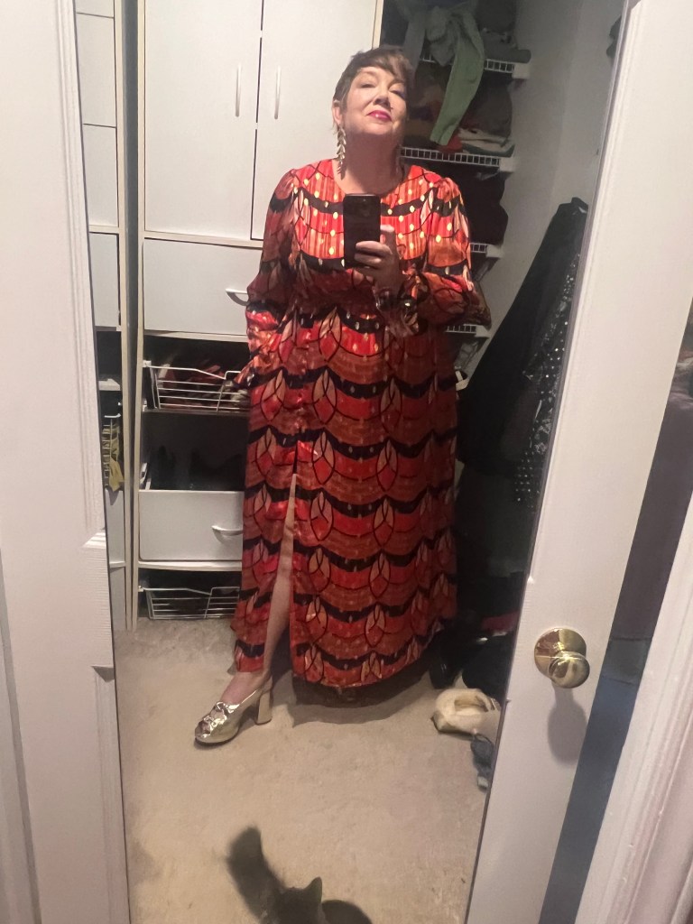 I bought this dress off a website in summer of 2022 with the intention of wearing it to my yet-unborn nephew’s elaborate baby shower. I felt like that event would likely involve a lot of baby blue gift swaddles, pastel balloons, and highly appropriate, likely gender-essentialist petit-fors, and as such, someone would need to bring the gin and her Auntie Mame A-game, even if I couldn’t accessorize with a cigarette holder. I liked the overdressed for late summer maxi dress vibes, as well as the slit that just dared someone to call it a muumuu.