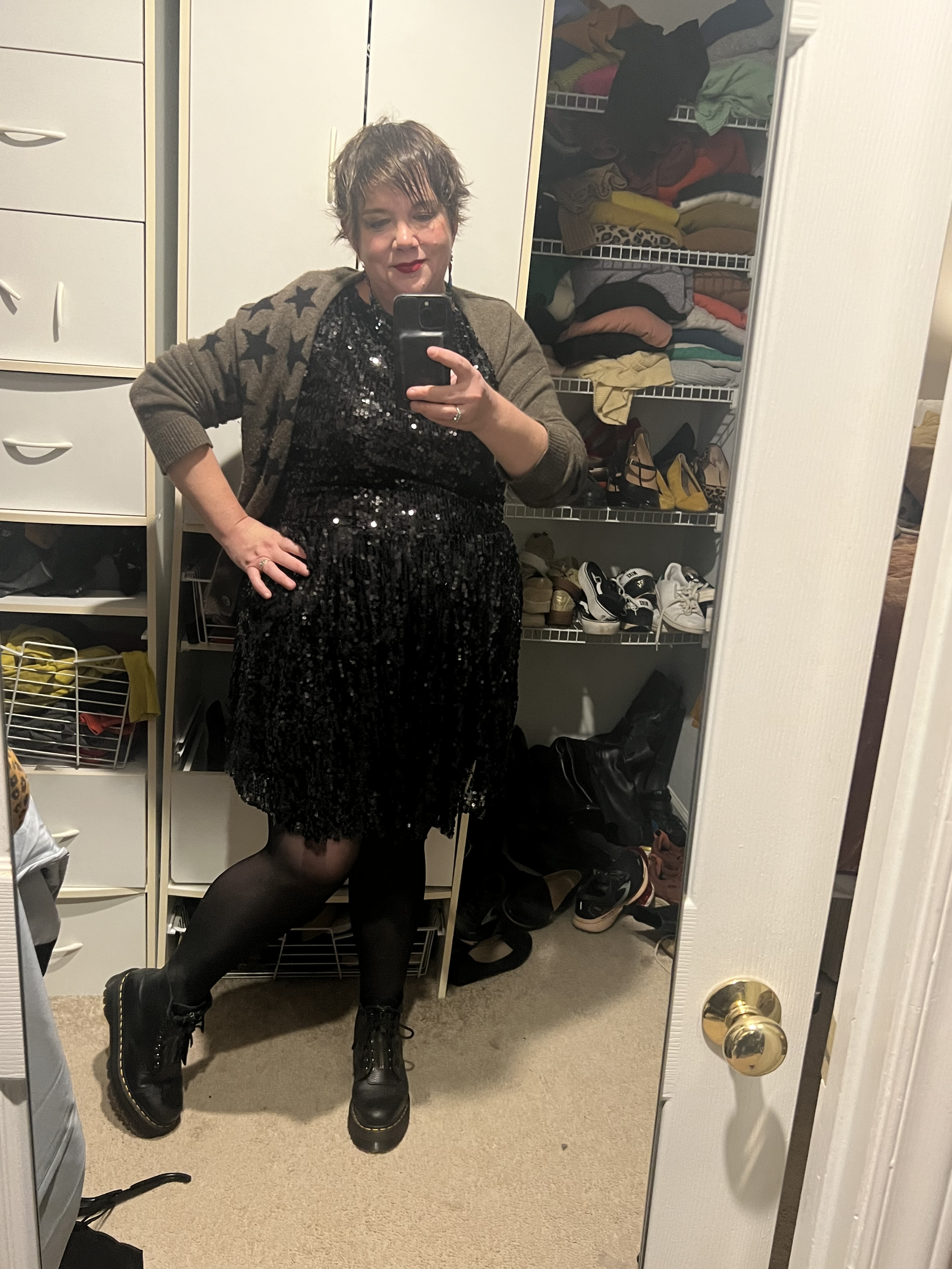 The Outfit: Is there any night more anticlimactic than New Years Eve? Looking back over the full scope of my life, I’m not sure I’ve ever had a New Years Eve that actually deserved the sequins I wore to it. Although a few were silly and low key, no-expectations fun, once I stopped hoping someone would kiss me at midnight. It’s been a while since one of those even. Consider the last four years: 1) ohmygod my landlord is selling the house and my mortgage is almost certainly not going to get approved and I’m probably dying so I’ll stay home and cry while packing my record collection in anticipation of forthcoming homelessness (2020) 2) it’s cold and rainy and in the middle of a global pandemic and maybe we’ll never be able to leave the house again (2021) 3) It’s cold and rainy and we’ve all cancelled any plan to go out again because Omicron so we’re going to sit on Zoom and worry together (2022) 4) my cat died and I’m definitely sick and I’ve just had to cancel all my evening plans and I’m headed into elective surgery in ten days (2023). It all worked out. Kind of. Mostly. Sort of. But these have been inauspicious starts to what have been, broadly, a collection of disappointments.