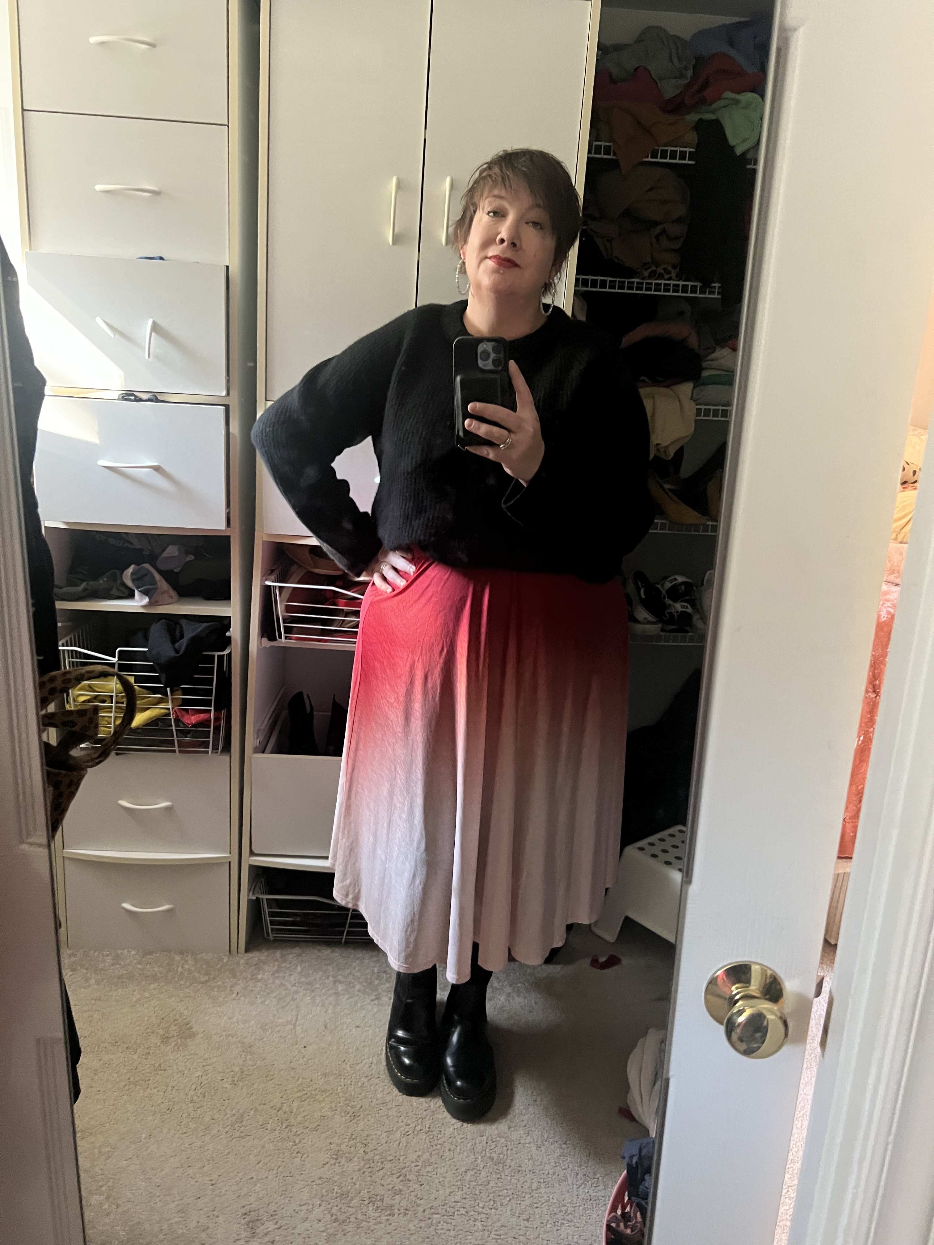 I’ve attached a picture of today’s outfit, because I don’t like to end on such a a serious note and I liked writing about the outfits (I’ll probably write some more about outfits). This one involves a skirt I think is supposed to be for ballerinas. I am not a ballerina, by any stretch, but I do love their outfits. If I do, in fact, stress out and my chest explodes, Alien-style, because I’m so stressed out worrying that my chest might explode, please know that there are plenty of tutu-adjacent skirts in my closet to go around. Don’t judge.