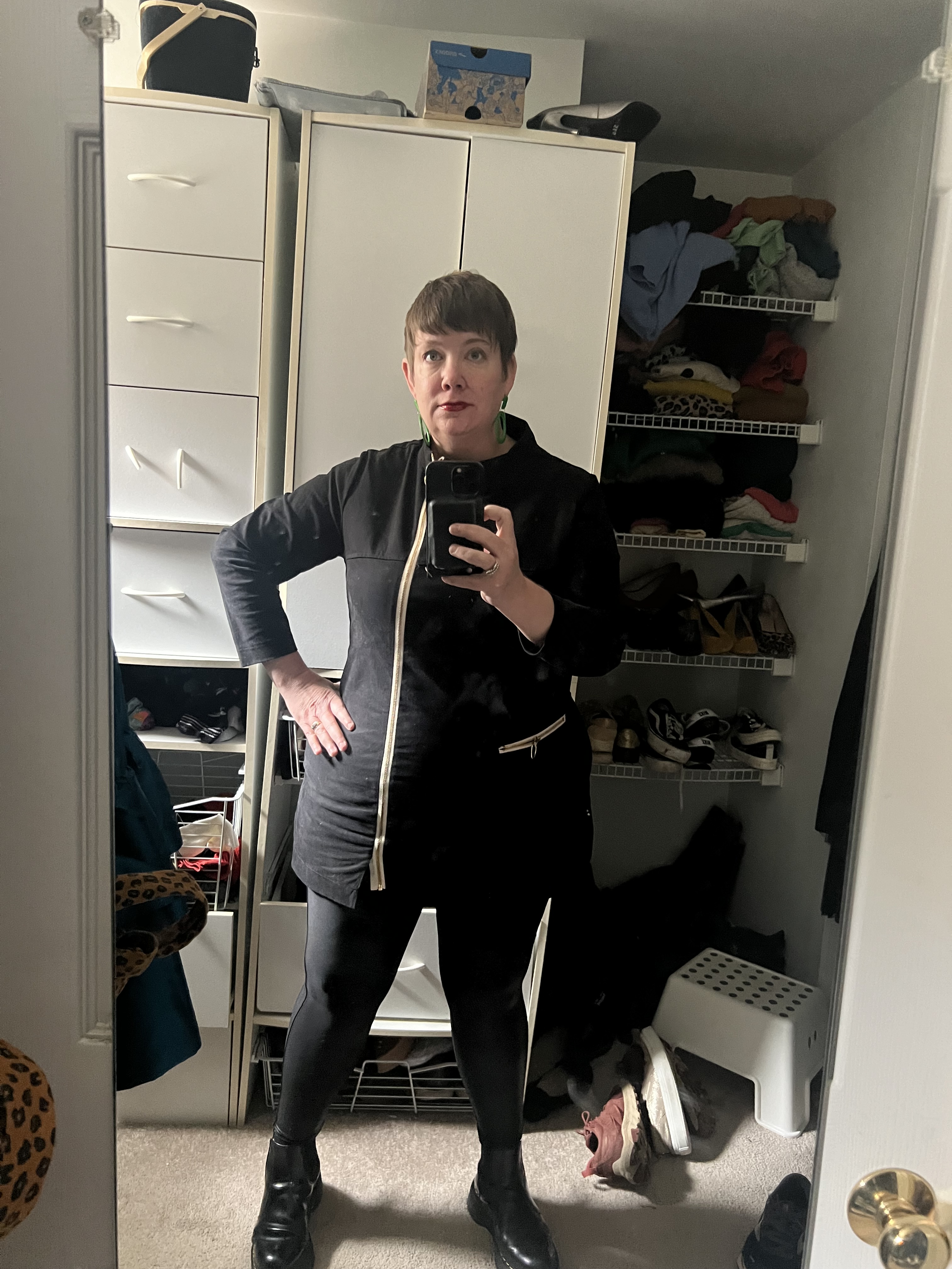 This dress, cotton, twill, zippered, resembling what a petty officer might wear on the Mod side of the Battlestar Quadrophenia, was something she found for me via a small, woman-owned, size-inclusive brand (all things I enjoy). I ordered if for myself sometime mid-pandemic and barely wore it out because it is very short. But I absolutely adore it. Hence.