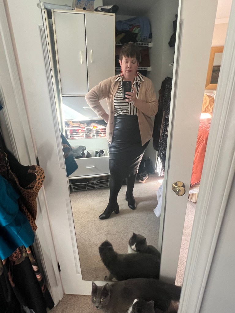 My memory of buying this skirt is hazier even though it happened easily twenty-five years later. Survey says it was sometime pre-pandemic when I saw it on sale and thought “sure, why not.” You never know when you’re going to need a conservative black pleather garment to wear to a hair metal funeral mass, or, like, apply for a loan at goth bank or whatever.