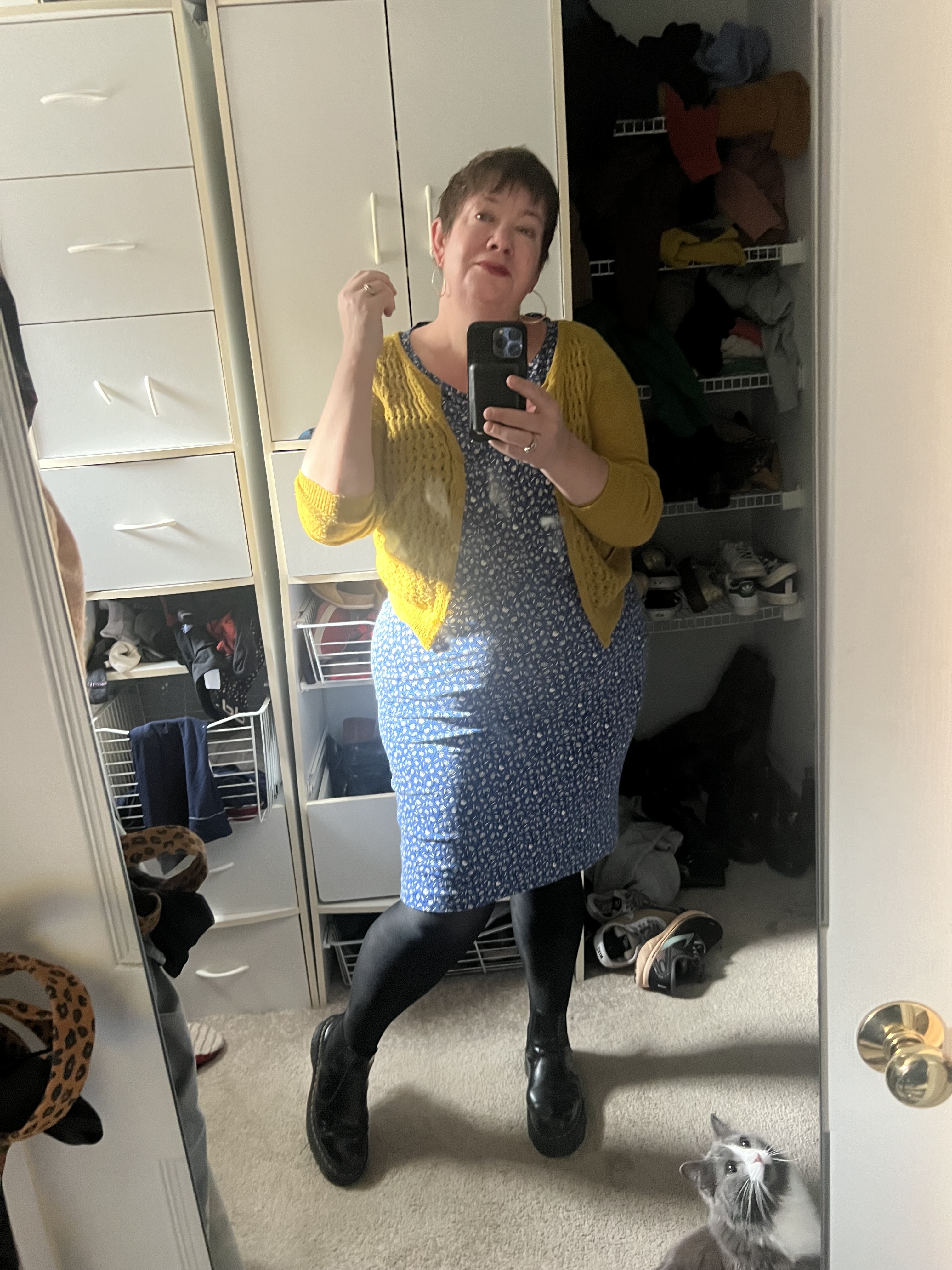 This was dress was yellow-sticker discounted, so it was cheap. And I’m a sucker for periwinkle-adjacent blues. With the sweater and tights, this dress could basically have been in wardrobe rotation at any point since, roughly, my senior year of high school. Nostalgia.
