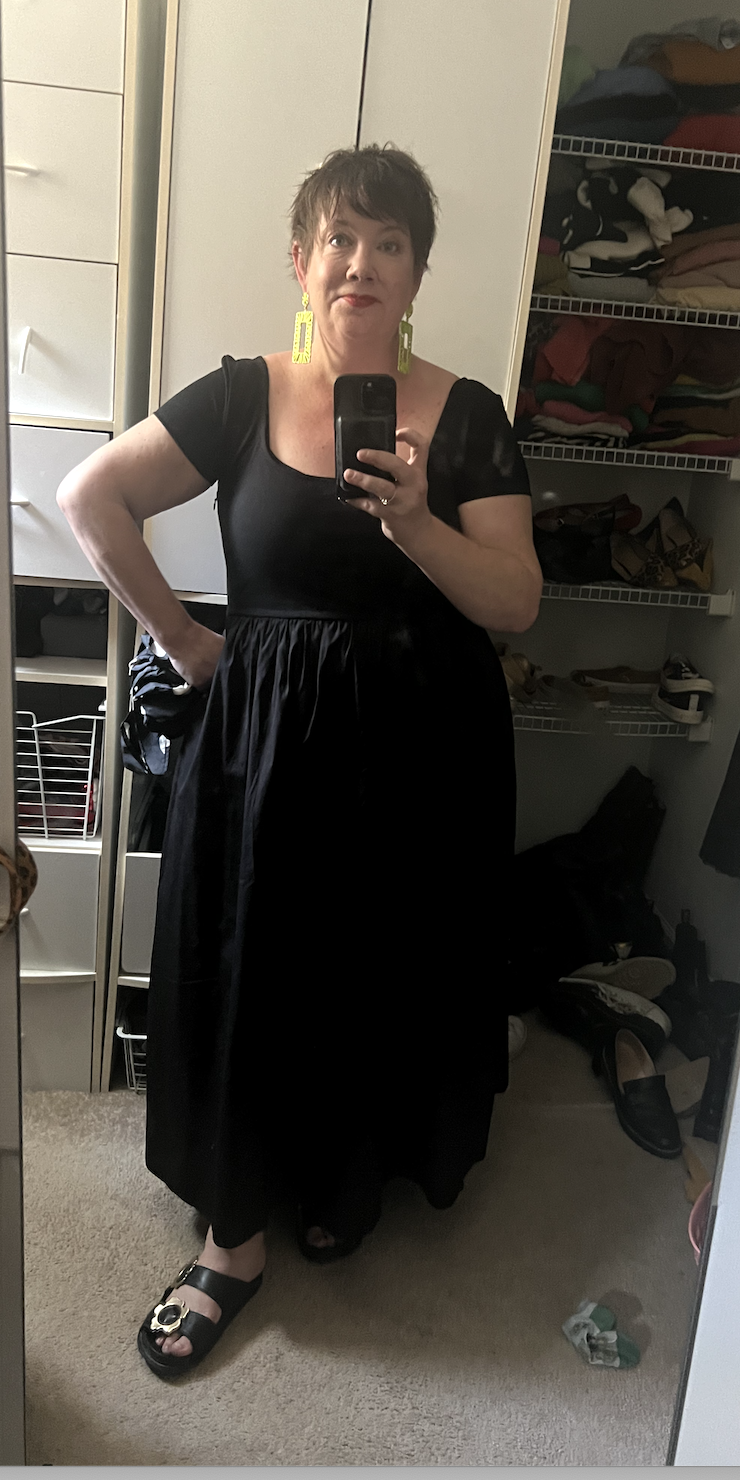 In my defense, this one is a classic. Comfortable. Billowy. Pockets. It feels like it is made to be worn with an appropriate sunhat (for me, straw, SPF 50+, brim at least the width of a small café table) and sunglasses (cheap, round, each lens roughly the circumference of a standard size ramekin, like Jackie Onassis is your baseline here). It’s a dress that feels aspirational in that it feels like the sort of thing I might wear on luxurious seaside vacations, but also practical in the sense that I can wear it around the house while I speak terrible Italian to the cats and pretend that they’re going to arrange a day trip for me over to Capri or wherever.
