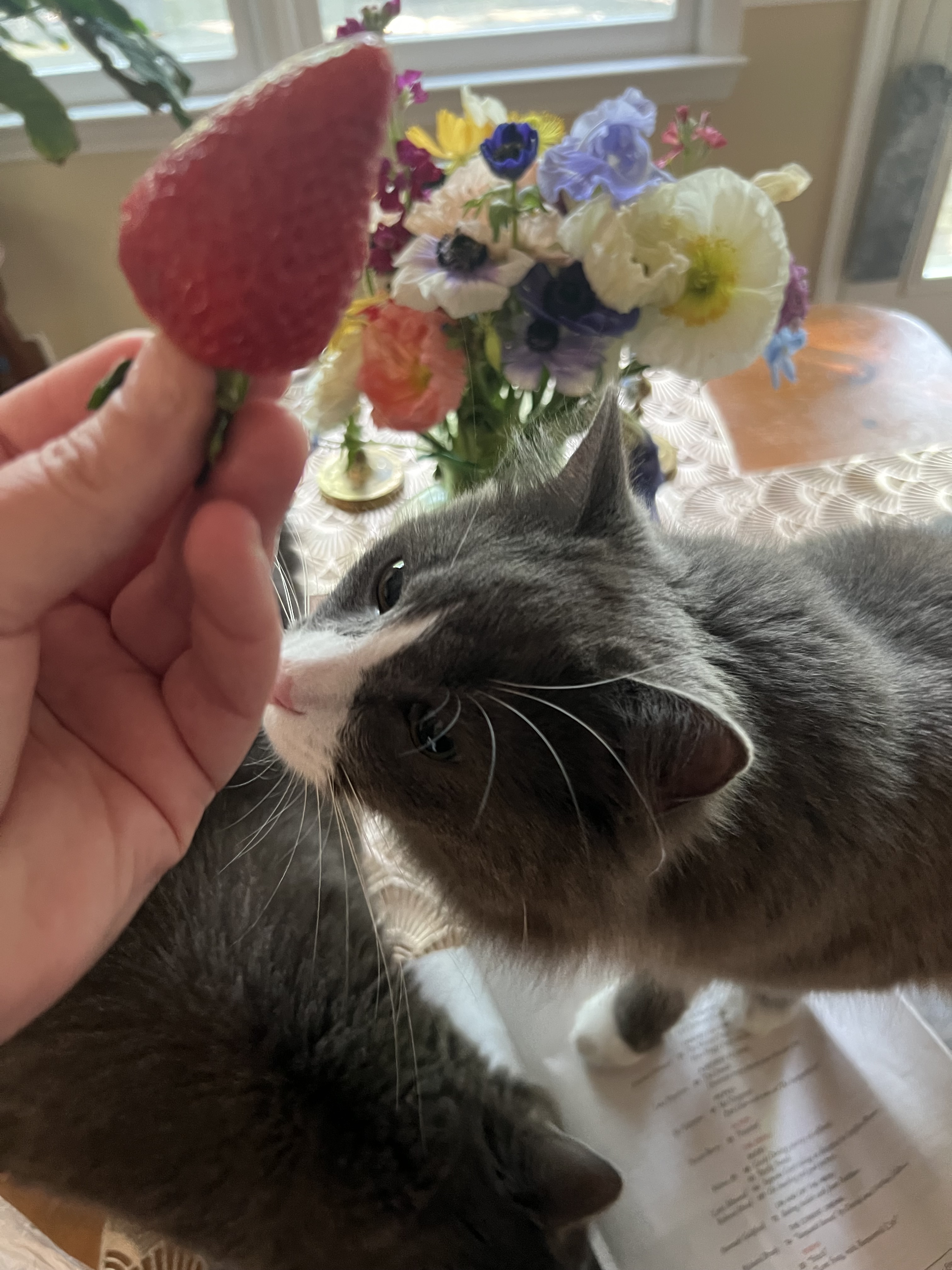Outfit: I’m in the beginning weeks of what will be a wild amount of work travel, so I’m trying to spend the day doing nothing more taxing than making a salad, taking a walk, and getting irritated that my neighbors peonies are already blooming while mine are not. I chased a bit of a hangover (last night was National Cat Lady Dady; friends came over to read cat tarot and eat pizza–this really happened–and I was utterly defeated by gin and tonics) with about four cups of tea and went the to co-op, where I discovered strawberry season has officially begun. It’s early enough that this should probably make me uncomfortable, but I love strawberries.
