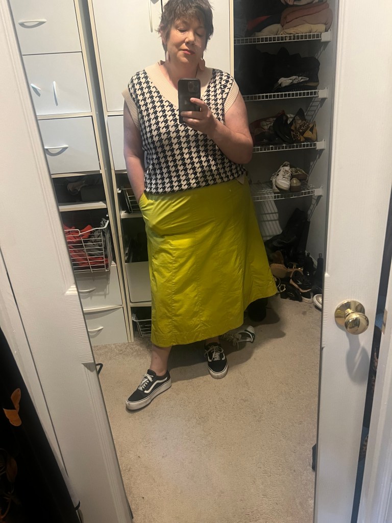 I’ve bought less recently. Maybe because I’m getting older and sometimes doing drop waist jersey dresses in primary colored ditsy prints makes me feel like I’m auditioning for the red hat club (all due respect, but I’m not ready yet). This skirt, however, called to me, because I have a perverse love of whatever the color that operates in the headache zone between chartreuse and mustard, and when the world needed back up again back in 2021, I was sure I needed something bright to let people know I was on the way.