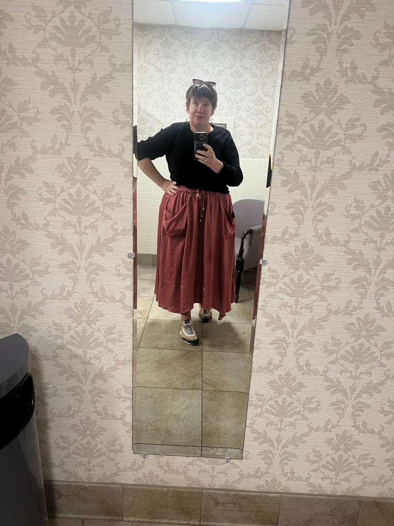 I bought this skirt about a year ago because I love rose color. In warm, or warm-ish weather, I wear it all the time. I wore it, in fact, to the Beyonce Renaissance tour last August in Maryland. It was the show that almost got rained out. (I want you to know that both I and this satin skirt survived the storm and had the time of our lives). But before that I wore it to book club one night at a local establishment that occasionally puts in a frose machine when the thermometer goes way up and the weather is sizzling hot. In between discussion of women in pop music, one of my fellow book club members told me she thought my skirt was quiet luxury. What I want to tell you is that I bought it on sale and it feels exactly like pajamas.