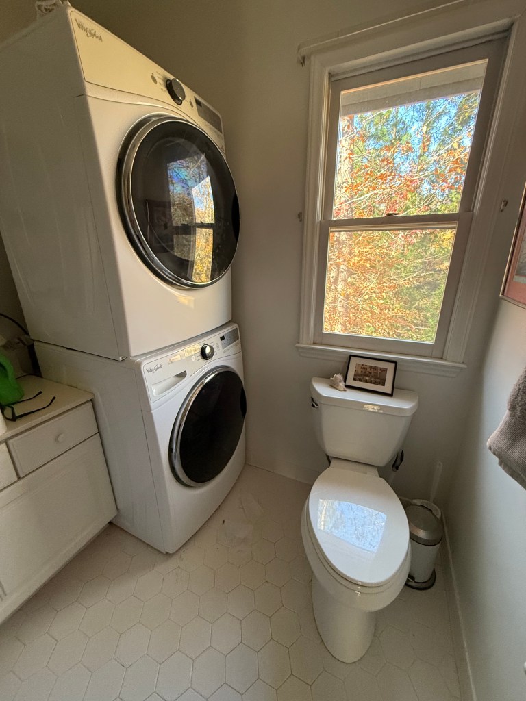 I have no idea which owner of the house decided to put the washer and dryer in the bathroom with the giant tub. Someone made that choice. For reasons I must assume made sense to them at the time. And because they did, the only place a washer and dryer can fit is stacked in the far corner flush against the giant sink and scant inches from the toilet. This is a less-than-ideal situation for a whole lot of reasons, among them making repairs more complicated and expensive because it’s impossible finagle the corner without a lot of moving things around. And again, one does not just move a bathtub.