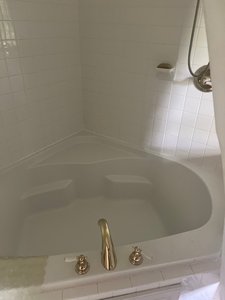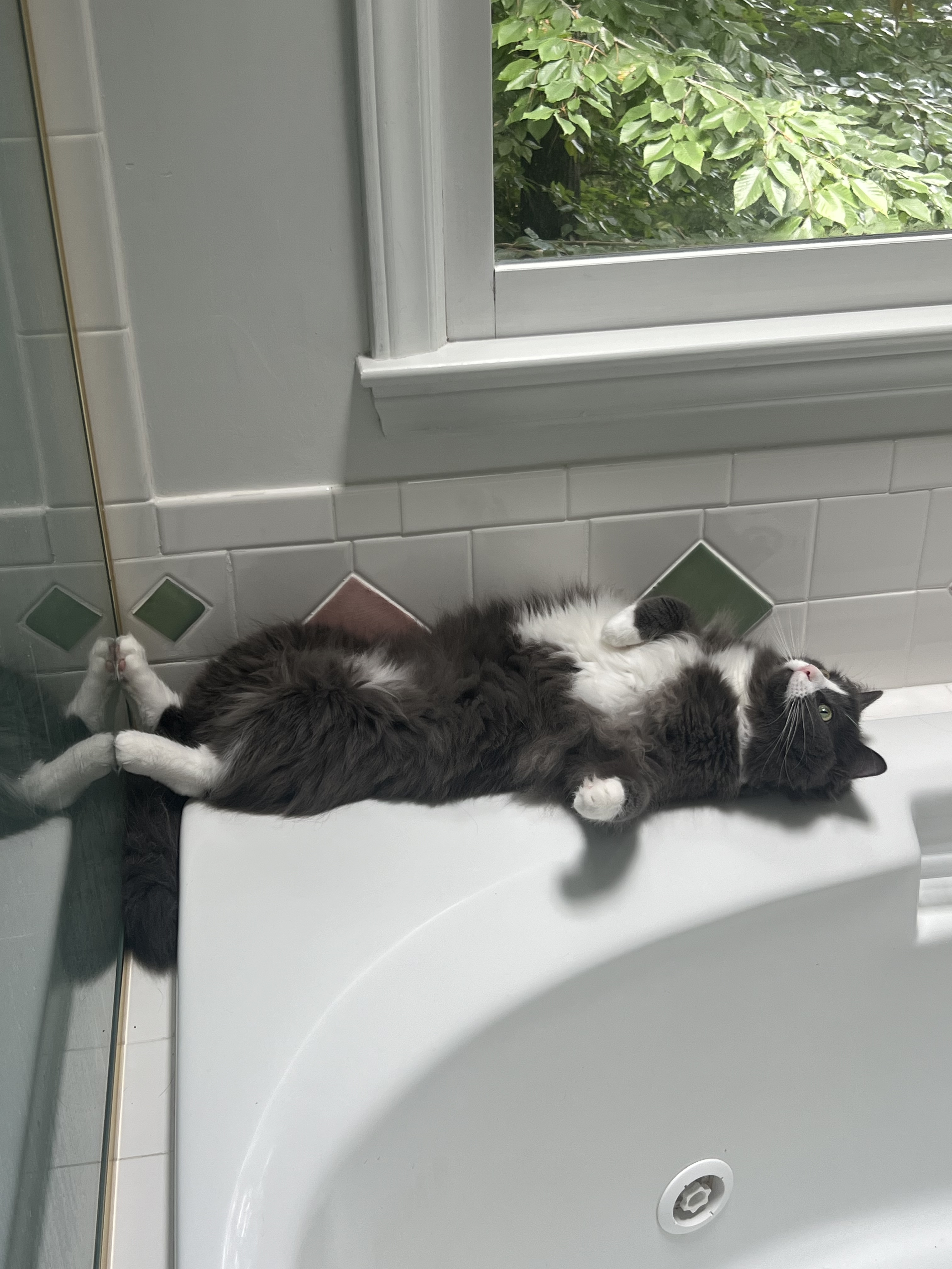 I’ve been laughing about the tub since I first toured the house and found it, then surrounded by a jungle-printed shower curtain left behind by the previous owner. Then Covid happened. Then things started going wrong. The drain broke. The shower nozzle fell off. Someone slipped trying to get crawl over the excessively tall side. The shower curtain rod crapped out I practically had to hit up a theatrical supply company to find anything close to large enough (and that didn’t work). And on and on. The fundamental issue is the sheer size of the thing. It takes up, easily, half the room. Bathtubs are not easily moved. This one is tiled into the sink console beside it (also large).