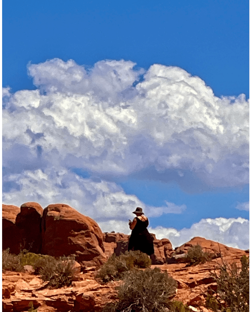 I’m not sure whether this is the set-up or the punchline, but I ended up buying the dress in Utah. Specifically, while taking a little breather after visiting few of the titular arches in Arches National Park. I was hacking out the discouraging end of a respiratory situation that may have been but was no longer Covid. Impossible to say for sure because I’d spent the week prior in an off-season ski rental in Telluride, where the closest place to find out was 70 miles down the mountain. This is not an exaggeration. I asked the sole pharmacist in town and he told me that not only did he not carry Covid Tests because Covid did not exist there. “People here are all very thin and fit and our air is too clean for sickness. We don’t have Covid in Telluride.” Then he offered me some Ayurvedic herbs and a 250$ French facial moisturizer that he promised would absolutely erase my tragic eye bags. I countered by asking for Sudafed. He said he didn’t carry it, but he could throw in a sage smudge stick if I’d pony up for the French moisturizer. I told him were at an impasse and left the store masked and purchaseless, a fat Typhoid Mary infecting the healthy, fiy un- eyebagged locals.